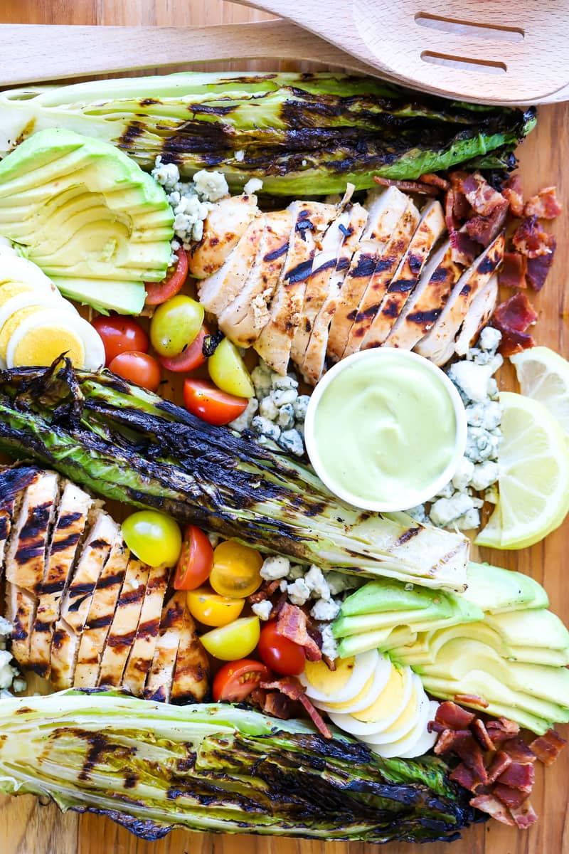 You will love this Grilled Cobb Salad with Avocado Dressing! It's the perfect salad for summer with marinated and grilled chicken, grilled romaine, cherry tomatoes, hard boiled eggs, avocado, blue cheese, bacon and avocado dressing.